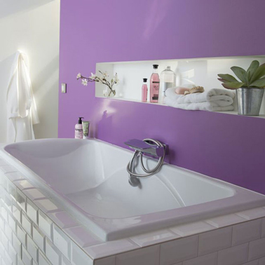 Dans la gamme des couleurs toniques, sans conteste le violet est la teinte de peinture qui vous booste une salle de bain en un coup de rouleau ! Pour donner un bel effet dynamisant dans une salle de bain blanche, il suffit souvent d’apporter de la couleur sur un seul mur, d’autant que cela permet de conserver la luminosité de la pièce et souvent de l’accentuer. Ici, le mur de la baignoire peint avec une belle couleur parme moyen finition satin sublime la brillance du carrelage blanc blanc et celle de l’acrylique. Peinture : Bali moyen, Gamme Couleur du Monde Dulux Valentine chez Castorama