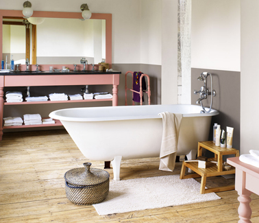Pour donner du peps par la peinture sans tout casser dans la salle de bain, taupe et lin, deux couleurs aux tonalités chaudes qui renforcent l’impression de confort et forment une association idéale pour mettre en avant des meubles de récup repeints. Pour mettre ces deux couleurs sur les murs mieux vaut réserver la peinture taupe pour le bas des murs en guise de soubassement et peindre le haut du mur avec la couleur lin pour donner de la hauteur à la pièce et augmenter la luminosité. Et pour créer un style rétro chic, il ne reste plus qu’à repeindre les meubles de la salle de bain avec une peinture pour meuble bois couleur rose corail et ajouter des touches de blond doré avec des paniers ou petit mobilier en osier. Couleurs peinture : Terre Cendrée, Lin Brut et Rose Malice gamme Cuisine & Bain Dulux Valentine