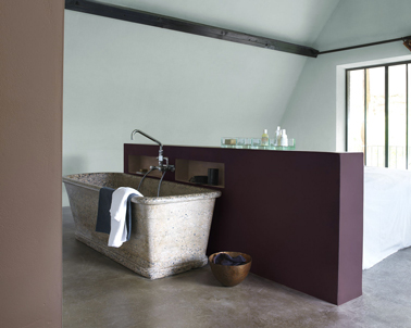 Bel exemple de la force de la couleur pour structurer l’espace de la salle de bain lorsque celui-ci s’intègre dans une suite parentale. Au côté d’un vert d’eau très doux, le muret central qui fait office de tête de lit d’un côté et d’appui pour accueillir la baignoire en pierre de l’autre, est peint en prune pour séparer les deux fonctions de la pièce et renforce l’impression de douceur qui se dégage du volume. Le pan de mur taupe ainsi que les coloris nuancés du carrelage au sol participent à l’équilibre teintes froides et chaudes dans cette pièce à double usage. Peinture : Taupe et Vert d’Eau gamme Crème de Couleur, Prune gamme UltraRésist Valénite Satin Dulux Valentine.