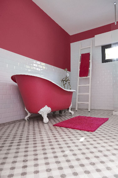 Un brin provoquant direz-vous que la rencontre d’un rose flamboyant avec du blanc dans la salle de bain ? Que nenni ! Lorsque la peinture sert de vecteur pour redonner vie à une salle de bain dont on veut conserver le charme de l’ancien, c’est efficace. Ici, tout a été pensé. Si la vieille baignoire a été troquée pour une flambant neuve, son style rétro a conservé sa place d’honneur et affiche sans complexe sur l’extérieur de sa coque un rose Bougainvillier, le même que celui de la peinture soulignant la pose très graphique du carrelage blanc. Peinture salle de bain aspect mat couleur Bougainvillier Zolpan.