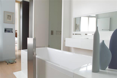 Dans une salle de bain qui reçoit la lumière extérieure, le blanc pur de la peinture murale vibre aux rythmes des jeux de cache-cache du soleil pour se faire tantôt gris, tantôt blanc. Ici, le blanc souligne les lignes contemporaines de la baignoire couleur gris Hammam. Peinture : Laponie Blanc Collection Couleurs de Monde Dulux Valentine.
