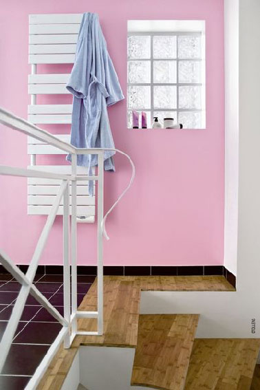 Avec plus de 1000 couleurs réalisables en machine à teinter, il y a de quoi peindre la salle de bain avec des teintes des plus audacieuses comme le Jaune sorbet, le rouge magenta Raspberry, le violet Bright ou encore le bleu Cyan. Selon l’éclairage dan la salle de bain, des couleurs qui peuvent souligner l’espace des vasques, celui des niches de rangements. et être associés avec de tendres gris ou taupe que vous retrouvez dans plusieurs intensité pour mieux construire votre harmonie couleur en fonction de l’ambiance recherchée dans la salle de bain. Et parce que la couleur de peinture salle de bain s’est émancipée, osez un rose lumière, la gamme des parmes et vert d’eau pour une note de fraîcheur bien venue dans la salle de bain. Peinture Tollens chez Castorama.