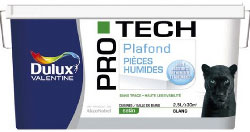 Une peinture pour plafond spécialement conçue pour les pièces humides (salle de bain, buanderie…) garantie plafond sans trace et lessivable. Peinture monocouche en base blanche aspect satin, elle se teinte si besoin avec des colorants universels. Séchage complet en 2 heures. Matériel : Rouleau spécial plafond, fibres 10 à 12 mm, pinceau à réchampir. Conditionnement : 2,5L Peinture Plafonds cuisine et bain, Dulux Valentine Prix : 40.90 € chez Leroy Merlin.