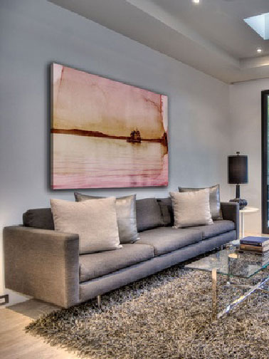 Dans ce salon à l’architecture contemporaine, le Velux et les spots basse tension encastrés dans le plafond ont permis de peindre ce dernier avec une teinte de taupe clair aux tonalités chaudes faisant écho à celles du parquet permettant d’envelopper la pièce d’une impression de confort absolu. A l’inverse, c’est une teinte froide de peinture grise qui recouvre les murs, renforçant ainsi l’invitation généreuse du canapé taupe à investir la pièce pour des moments de réelle détente. L’immense tableau au dessus du canapé, un diptyque sur bois peint avec de subtiles nuances de beige rosé rappelant celles des coussins confirme si besoin était, combien l’association de tons neutres et de couleurs naturelles peut adoucir le salon. Source : Gild.com