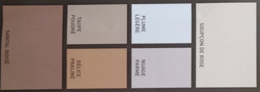 Nuancier peinture taupe pour harmonie salon : de gauche à droite : Santal Boisé, Taupe Poudré, Délice praliné, Plume Légère, Nuage Parme et Soupçon de Rose. Peinture Le Mat Dulux Valentine