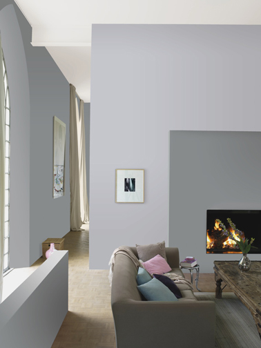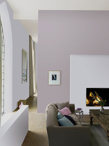 Sur la cloison de séparation du salon en enfilade avec la salle à manger, un subtil ton parme valorise le foyer de la cheminée design. Photo Dulux Valentine.