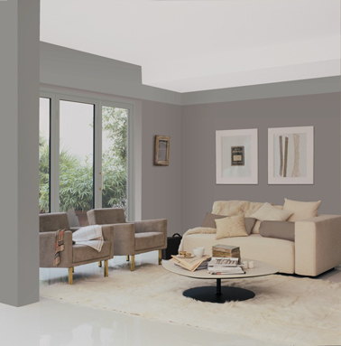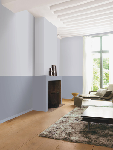 Peinture soubassement couleur Gris Charme. Couleur murs Gris Flocon. Collection Le mat des gris Feutrés Dulux Valentine