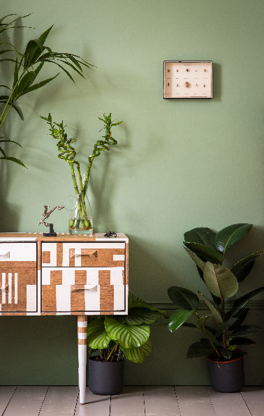 Avec ce vert tendre sur les murs du salon on fait le plein de vitalité pour recharger les batteries après une journée de boulot. La couleur Breakfast Room Green crée dans la pièce une ambiance nature et fraiche. Objectif de cette nouvelle teinte tendance de vert dans la gamme peinture, dégager un climat apaisant et ressourçant par un effet de contraste avec des teintes naturelles de ivoire et brun clair. Une teinte parfaite à entourer de quelques plantes vertes et d’accessoires en bois clair pour aménager un espace de verdure dans le salon. Peinture : murs vert : Breakfast Room Green® No.81 , Plinthes : Calke Green® No.34, Peinture grise sol parquet : Light Gray™ No.17 collection Floor Paint.