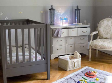 Ambiance romantique pour la chambre de ce bébé apportée par la commode et le fauteuil réservé aux câlins. Le soubassement est animé de décoration réalisées au pochoir sur la peinture grise. Le lit à barreaux est peint couleur taupe pour créer un doux contraste avec la dominante de gris. Les couleurs du tapis, de l’animation lumineuse et des jouets sont volontairement choisies dans des tons pastels pour accentuer l’ambiance cocon et fanfan de la chambre.
