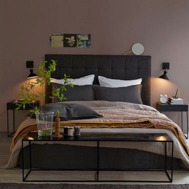 Si vous voulez une déco de chambre aux couleurs dites féminines et une ambiance intimiste, nul doute que l’association d’une peinture taupe avec du linge de lit et accessoires déco prune est parfaite. Ici, le taupe recouvre un seul mur tandis que le reste de la chambre est peint dans un joli ton de lin. Très sympa, drap et taies d’oreiller prune trouvent un écho avec les couleurs du tableau et des rideaux en voile. Les petites touches de vert amènent une note fraicheur naturelle.