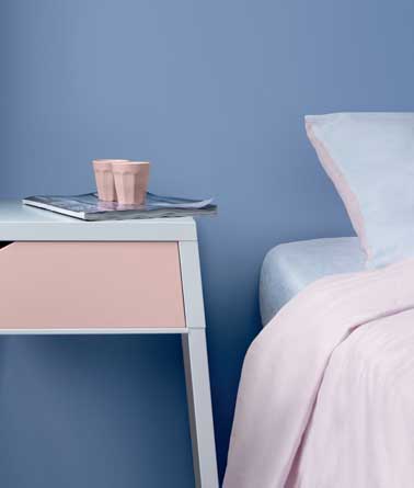 En peinture chambre, ces nouveaux rose et bleu sont des couleurs câlines propices à la détente. La couleur bleu éclaire les murs et et le rose réchauffe la pièce tout en douceur. Au final, un havre de paix bienvenu dans une chambre de fille ou d’ado et un ticket d’entrée cocooning dans la chambre parentale !