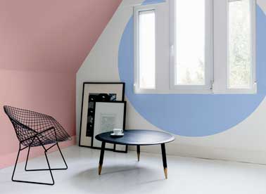 Style rétro vintage dans ce petit espace sous les combles. Une peinture blanche en toile de fond laisse la part belle aux couleurs pastel Rose Quartz et bleu Serenity. Placées judicieusement en touches colorées, le rose et le bleu se répondent tout en douceur. Le jeu bicolore installe une déco salon apaisante et zen.