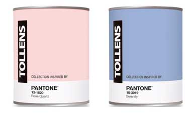 Rose Quartz Tollens inspired byPantone® 13-1520 et Serenity Pantone® 15-3919 sont des peintures prêtes à l’emploi, aspect satin. Prix : 36 € le pot de 1 litre et 60 € le pot de 2 litres. Ces couleurs sont également disponibles dans de multiples finitions (mat,velours, satin et brillant) en machine à teinter Prix : de 22 à 47 €.En exclusivité chez Castorama et dans les 167 magasins Couleurs de peinture Tollens.