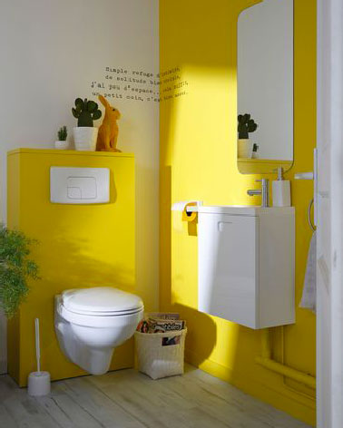 Sur les murs et le coffrage du WC suspendu Peinture multisupports Architecte Dulux Valentine Couleur Carton Jaune satin, 0.5L prix : 9.95 € Leroy Merlin.