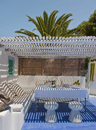 Superbe ambiance sous cette pergola bois d'une maison grec. Sur le sol en ciment blanc est peint un grand tapis bleu qui sublime le blanc des banquettes et de la pergola.