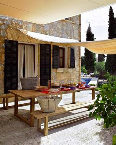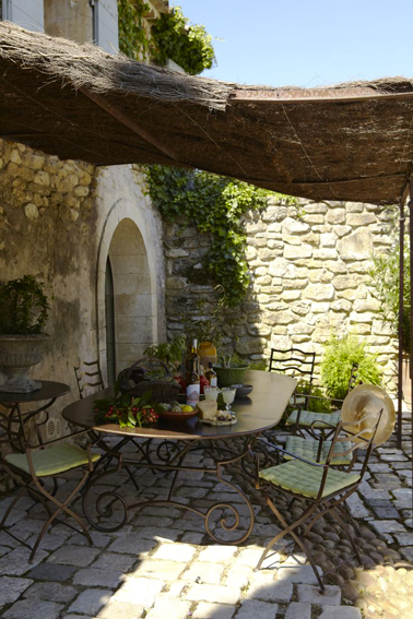 Pergola terrasse en brande de bruyére installée devant maison provençale pour protéger la terrasse du soleil avec salon de jardin