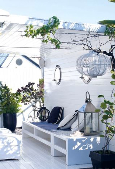 Détour vers l’océan avec cette petite terrasse d’une maison de l’île de Ré. La transparence des plaques en PVC ondulé pour couvrir la pergola renforce la magie de la terrasse. Le PVC  assure une protection sans problème et permet de mettre en avant l’ambiance blanc bleu sans atténuer l’effet lumineux du blanc.