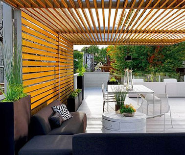 De l'ipé pour la pergola en bois d'une terrasse design abritant le coin salon et table de jardin. Le soir le plaisir de la terrasse prend ses quartiers dans les grands canapés face au jardin.