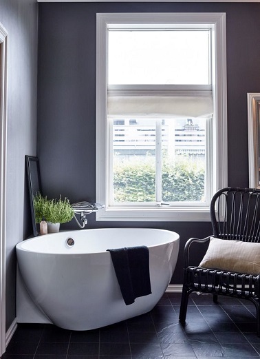 Un baignoire sabot dans une salle de bain violette.
