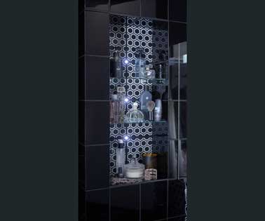 Etagère murale en verre transparent installée dans une niche déco, une solution gain de place dans une petite salle de bain Glass Style Leroy Merlin
