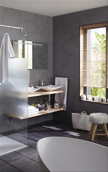 Vous manquez d’espaces de rangement dans votre petite salle de bain ? Pas de panique. La solution c’est d’aménager des petites étagères afin de pouvoir ranger serviettes de bain et accessoires de toilette. Dans cette salle de bain, on a installé une étagère en bois identique à celle du plan vasque où elle trouve facilement sa place sans encombrer l’espace. Une bonne idée à reprendre qui ne gâche pas la déco de votre petite salle bain tout en garantissant davantage d’espace pour tout ranger et s’organiser. Salle de bain Leroy Merlin