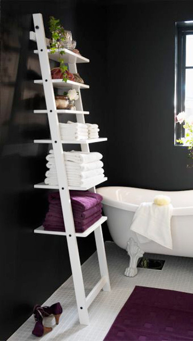 Une étagère murale en forme d’échelle, c’est une jolie idée déco dans une salle de bain qui ne permet pas d’accueillir un meuble à cause de sa petite superficie. Dans cette salle de bain aux murs couleur chocolat, l’échelle sert d’étagère pour entreposer toutes les serviettes de bain. Un rangement qui prend un minimum de place et qui embellit la déco de la pièce, que demander de plus ?
