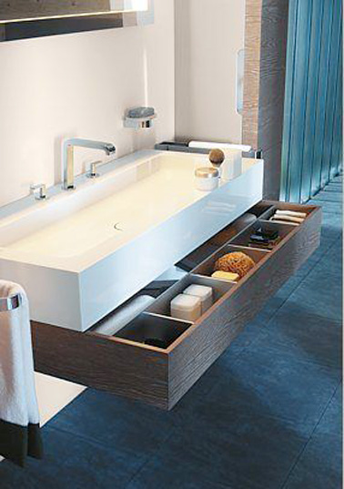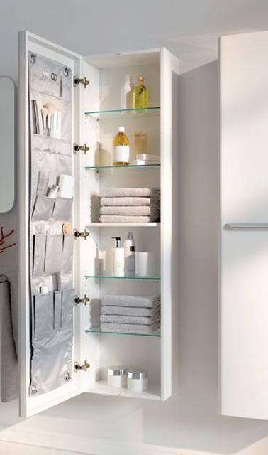 L’astuce incontournable très utilisée pour gagner de la place judicieusement dans une petite salle de bain, c’est le rangement en colonne ! Tout en hauteur et suspendu, le placard occupe peu d’espace, dégage le sol et offre un petit endroit fonctionnel pour une grande organisation. Un aménagement malin pour une salle de bain pratique et déco. Colonne de rangement Amovible Organiseur « My Day », prix : 790€, Keramag Design.