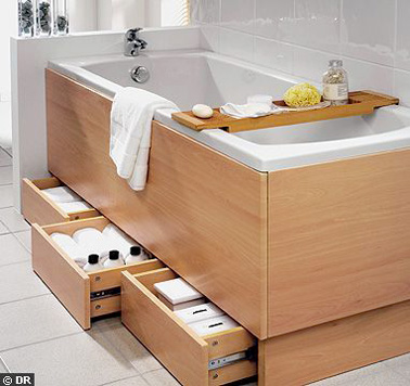Quand on est à court d’espace de rangement dans la petite salle de bain, on se doit d’exploiter toute la surface, et le dessous de la baignoire en fait parti ! Voilà une idée judicieuse pour ranger vos affaires de toilettes qui encombrent la salle de bain. Plusieurs petits tiroirs glissés sous l’habillage en bois de la baignoire vous permettent de garder hors de vue vos produits, pour ne pas gâcher la déco de la salle de bain. Une solution rangement très maligne.