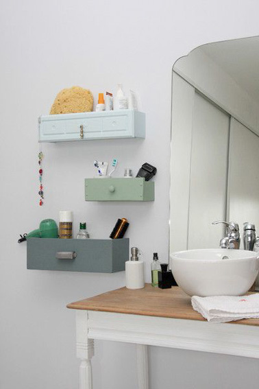 Ici encore, on investit les murs de la salle de bain en installant des petits rangements futés et ultra déco. Facilement réalisable et représentant une solution rangement pas chère, il vous suffit de récupérer les tiroirs d’un vieux petit meuble, de les couper pour en réduire la profondeur, de les peindre de la couleur souhaitée et enfin de les fixer de façon déco aux murs. Et voilà des rangements colorés pour stocker tous vos petits produits de toilette dans la salle de bain !