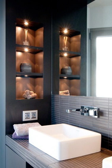 Avec des lumières d’ambiance qui soulignent leur présence, les petites niches de cette salle de bain ne manquent pas d’allure ! Voici des espaces de rangements ultra futés pour maximiser l’espace afin de pouvoir stocker vos affaires à proximité du lavabo. Une solution de rangement déco et tendance dans une petite salle bain design en nuance de gris.