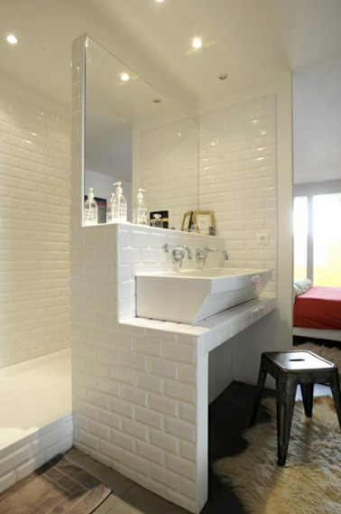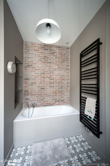 On les oublie bien souvent, mais les murs doivent être aussi utilisés pour exploiter et maximiser l’espace d’une petite salle de bain. Carreaux de ciment et mur de brique embellissent la déco de cette salle de bain taupe où une petite niche aménagée au dessus de la baignoire sert à ranger les produits de bain et de beauté. Autre astuce déco imparable pour gagner de la place dans une petite salle de bain, le sèche-serviette électrique mural préféré à l’encombrant sèche-serviette sur pied. Une salle de bain fonctionnelle qui exploite à 100% son petit espace.