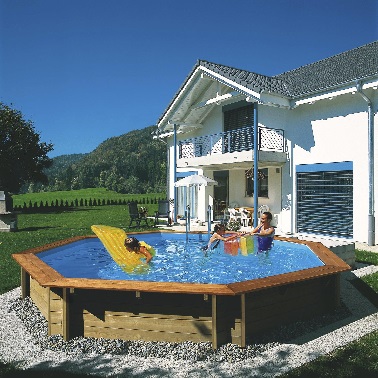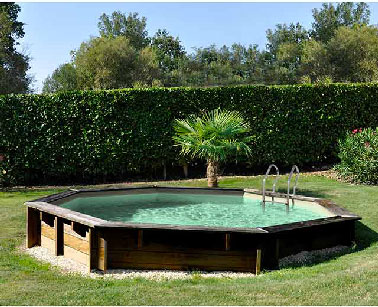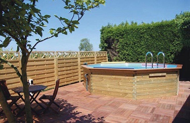 16 m3 d’eau pour cette piscine octogonale en pin traité autoclave Classe IV qui sort à peine du sol avec ces 1,20 de hauteur. Fournie avec une échelle intérieure en inox et une autre pour l’extérieur en bois et liner beige. Dim : diam 5,11 x H. 1,24 m Prix : 1999 € Castorama