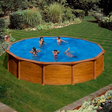 Une piscine hors sol en acier aspect bois doré