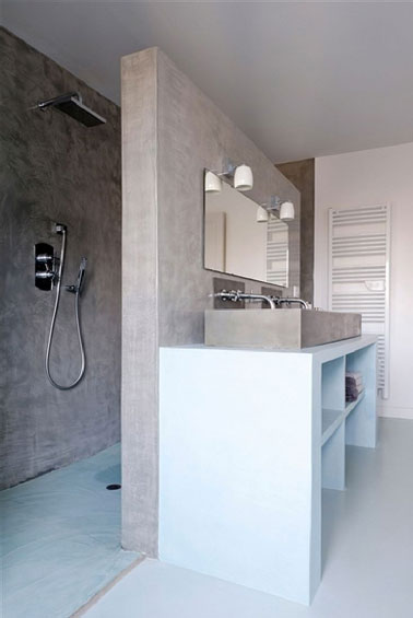 - S’appuyant sur la cloison de la douche italienne un plan vasque bâti en carreaux de plâtre enduit et recouvert d’une peinture étanche.