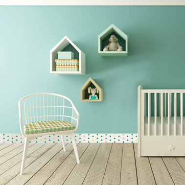 Avec un parquet blanchi et des murs de couleur vert anis, on a trouvé des plinthes qui se marient judicieusement à la déco de cette jolie chambre de bébé. Une plinthe comme une frise blanche décorée de petits triangles aux couleurs de la chambre, on ne pouvait pas rêver mieux. Une ambiance pastel idéale pour le repos de bébé.