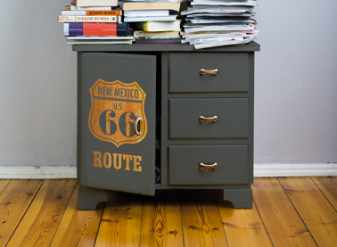 la commode repeinte avec peinture meuble satinée couleur gris béton et pochoir inversé motif Route 66 Maison Déco