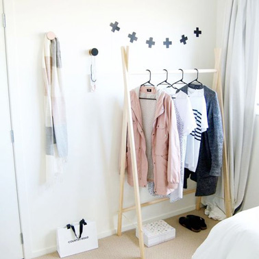 Sur le même principe que le premier portant à vêtement, réalisez celui-ci avec des tasseaux de section plus petite et prévoyez une barre de un mètre de long afin d’alléger la structure du portant. Dans cette chambre d’ado fille, les tasseaux sont laissés bruts et associés à des couleurs pastel pour un rendu tout doux mais rien ne vous empêche de peindre toute la structure du portant pour lui donner plus de pêche.