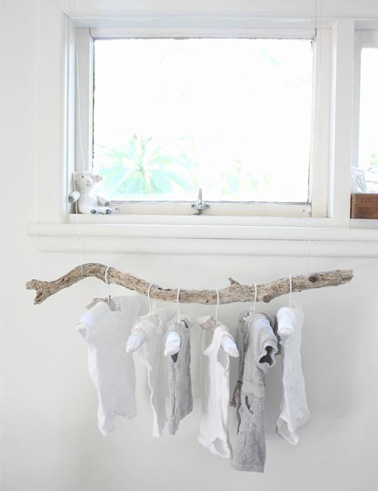 Un beau portant style nature prend place dans la chambre de bébé ! Pour le faire vous-même, suspendez une branche de bois flotté au plafond avec de la ficelle blanche. Ensuite il ne reste plus qu’à crocher des portes manteaux blancs, bleus ou roses pour suspendre les vêtements de bébé. Un résultat maxi déco qui peut se faire en duo avec une autre branche.