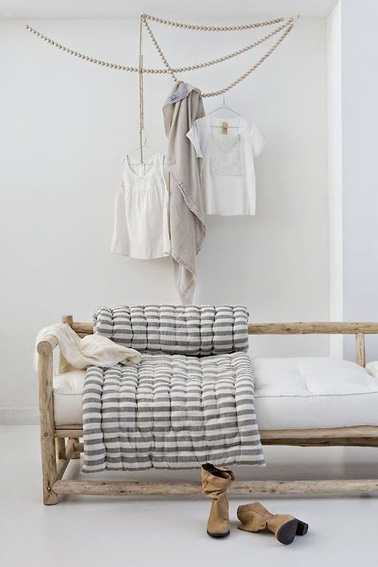 Suspendre vos vêtements au plafond, c’est une idée originale. Utilisez des grosses perles en bois naturel et enfilez-les dans une corde solide semi-épaisse de la longueur que vous désirez pour faire pendre votre portant au gré de vos envies. Faites pendre le tout au plafond à l’aide de crochets assez espacés pour pouvoir y suspendre élégamment vos vêtements. Et voilà un portant original réalisé avec trois fois rien qui participe à la déco de la pièce !
