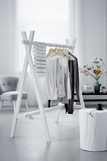 Pour réaliser ce porte vêtement en bois très élégant, munissez-vous de quatre grands tasseaux de bois que vous peindrez dans une couleur en harmonie avec la chambre. Prenez un tasseau et faites une encoche afin d’encastrer un autre tasseau au travers. Faites de même avec les deux autres. Fixez deux longueurs de bois sur les bas de votre portant à vêtement afin de maintenir le tout. Pour la barre de penderie, utilisez une barre de rideau ou un manche à balai. Voilà un portant hyper déco pour accueillir vos vêtements sans gâcher la déco de la chambre.