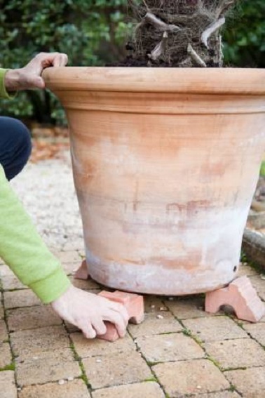 Première étape pour protéger votre palmier : surélever le pot. Placer quatre cales en briques sous le pot permet d’éviter à l’eau stagnante gelée d’être en contact avec les racines. Avant d’installer ces cales, choisissez judicieusement l’emplacement de votre palmier pour l’hiver à savoir dans un endroit majoritairement ensoleillé et plutôt à l’abri du vent.