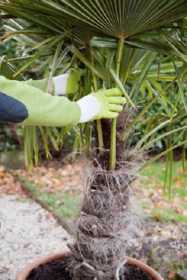 2ème étape : refermer le feuillage sur lui-même délicatement. Pour ce faire armez-vous de gants pour éviter les coupures puis regroupez les branches en un seul bouquet. Cet étape permettra aux jeunes pousses du milieu d’être mieux protégées car la chaleur émanant de l’arbre se concentrera au milieu avant d’être diffusée à l’ensemble des palmes.