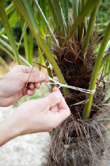 Ensuite, attachez les palmes du palmier entre elles avec une ficelle. Serrez juste ce qu’il faut pour que le feuillage soit bien refermé vers le centre de l’arbre. Evitez d’utiliser une ficelle en plastique ou autres matériaux de ce genre qui pourrait finir par compresser et étouffer votre palmier.