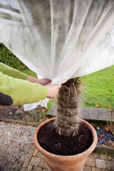 Vous pouvez maintenant mettre votre voile d’hivernage sur votre palmier. Cela aura pour effet de protéger notamment les palmes fines de l’arbre nommées lances. Nouez le autour de votre palmier à l’aide d’une ficelle. Ne serrez pas trop car cela pourrait emprisonner l’humidité et faire pourrir votre palmier. Par ailleurs, si les températures remontent au dessus de 0° levez le voile pour faire respirer l’arbre.