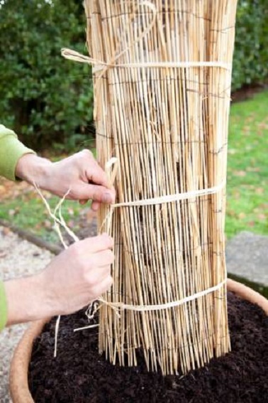 Placez des canisses en roseau autour du tronc pour garder au chaud l'arbre tout l'hiver. Attacher là encore la protection avec de la ficelle sans serrer.