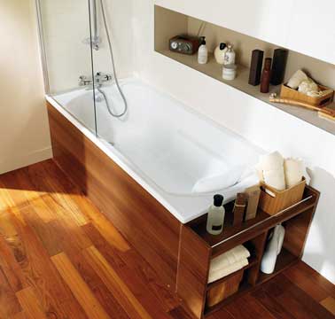 Plus classique dans sa forme, mais tout aussi capable de créer une ambiance zen dans la salle de bain, la baignoire rectangulaire possède l’avantage d’être disponible dans de nombreuses dimensions et revêtements. Elle s’adapte facilement à l’espace environnant, qu’il soit étroit ou spacieux. Pour sublimer la déco d’une salle de bain zen on profitera des formes simples de la baignoire pour l’habiller de bois à l’instar du sol avec un parquet salle de bain en teck, bambou, ou toutes essences de bois exotique.