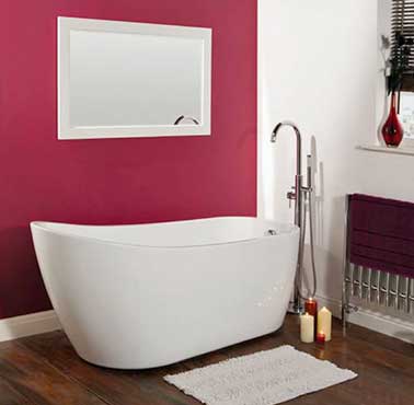 Cette petite baignoire asymétrique mise sur la féminité dans le choix des couleurs rose magenta et blanc des murs. On transforme l’espace en havre de paix zen en optant autour de la baignoire îlot pour des matériaux chic et une déco sophistiquée. Ici on a choisi un parquet en bois foncé, un porte serviette en inox et des détails contemporain sur la robinetterie. Autant d’éléments au design sophistiqué pour créer une décoration zen et féminine dans la salle de bain. Petite baignoire îlot 949 € Hudson Reed.