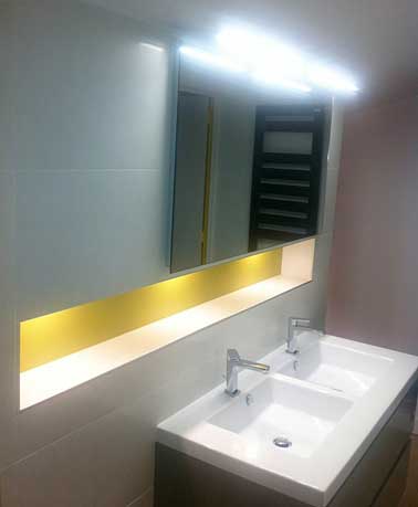 Une bande de couleur jaune donne de la profondeur à la petite salle de bain