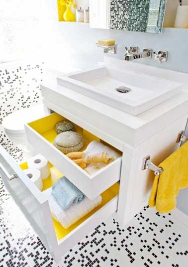 Placé en touche colorée dans la déco, le jaune amène de la lumière dans la petite salle de bain. Ici il est placé à l’intérieur des tiroirs d’un meuble blanc pour égayer la pièce. Les serviettes et les objets déco jouent les rappels colorés. Astuce petit espace : le carrelage bleu ciel qui éclaire la salle de bain et le miroir qui augmente l’impression d’espace.