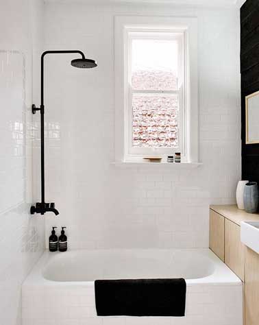 Votre plafond de salle de bain est bas et fait paraitre la pièce plus petite? Optez pour des rayures verticales avec du carrelage noir et blanc, il donnera de la hauteur aux murs de la pièce. Un mariage de couleurs élégant à coordonner avec une déco sobre et des meubles laqués blanc et noir.